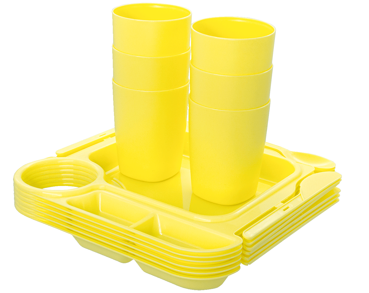Набор пластиковых тарелок с приборами идеально подойдет для туристических походов и посиделок на природе. Такие тарелки удобно брать с собой из-за небольшого веса, легко мыть после использования и складывать в один бокс.